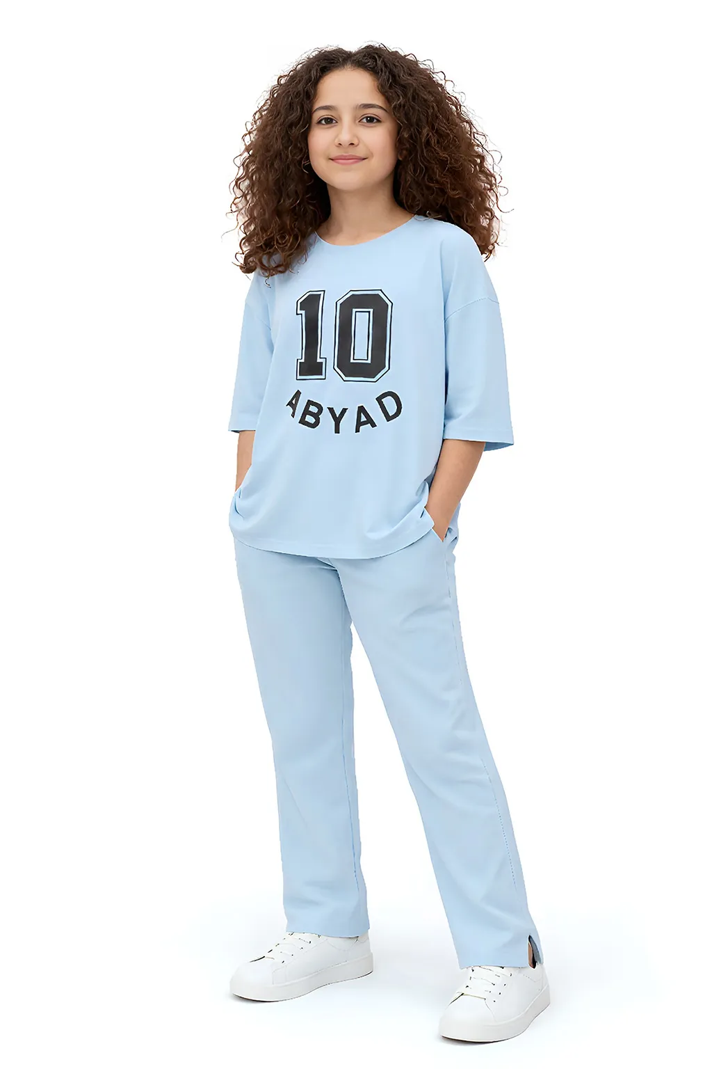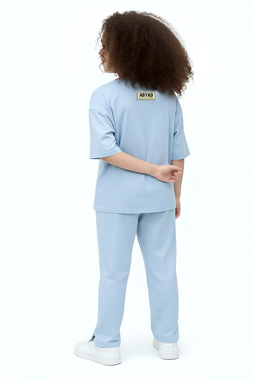 Designed in the UAE, this set features an oversized shirt with a crew neck, dropped shoulders, and short sleeves, complemented by a subtle logo detail for a modern mini wardrobe. The matching trousers are designed in a straight fit with a split-hem bottom, featuring an elasticated waistband with drawcords and convenient side pockets. Crafted from a premium interlock construction of 95% Cotton and 5% Elastane, the fabric is super soft, lightweight, and breathable, providing a skin-friendly feel with normal stretch. Please note that the actual product color may vary slightly due to lighting and photography.